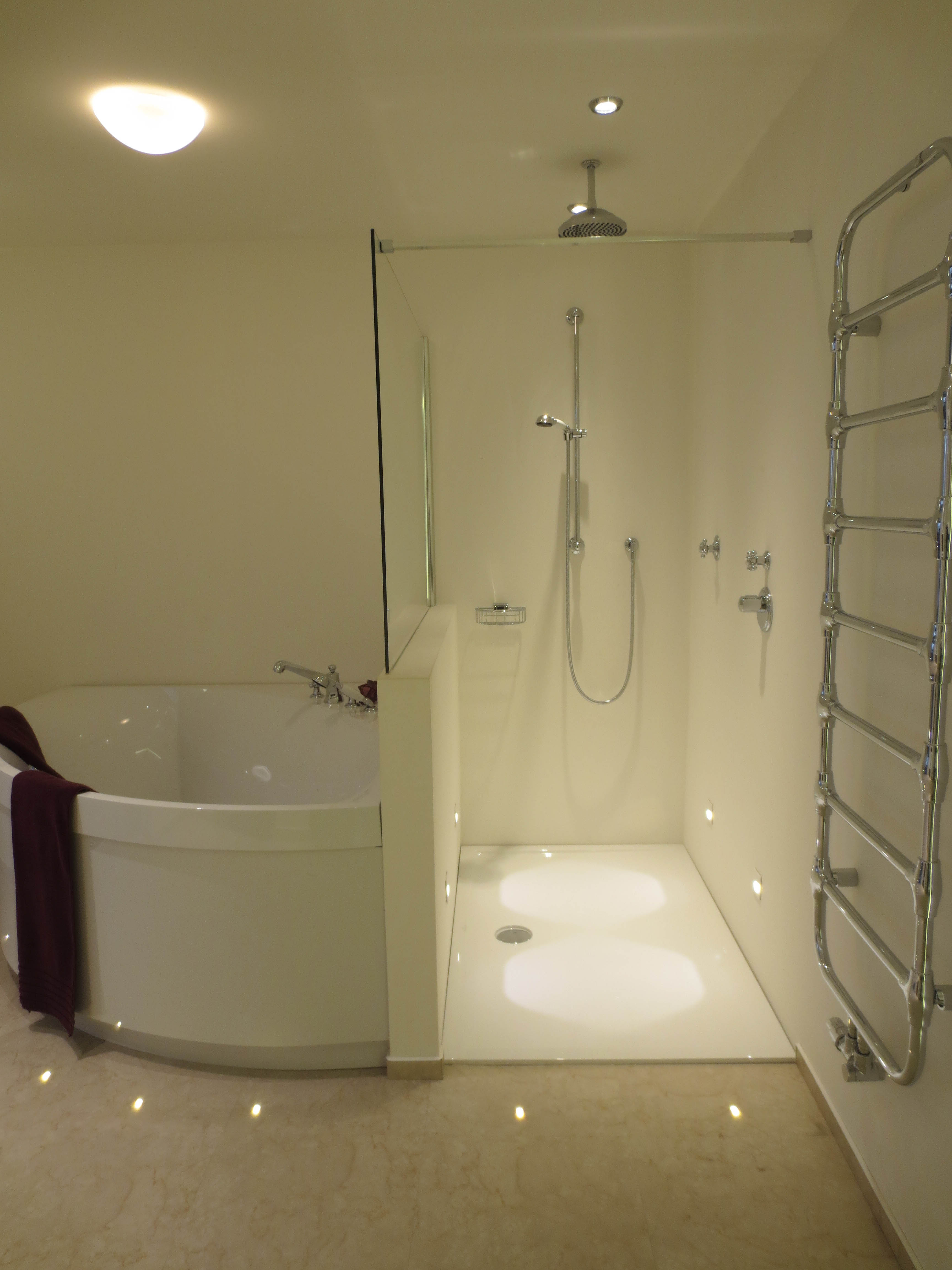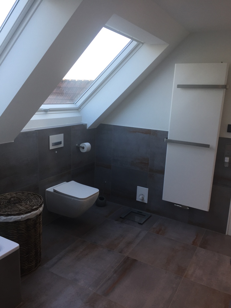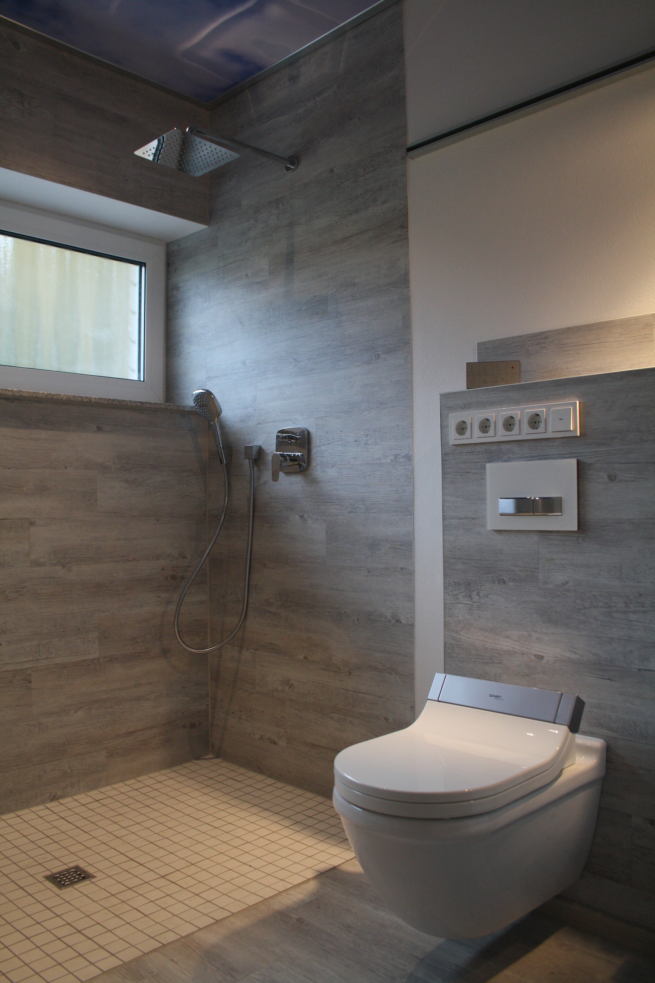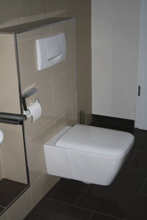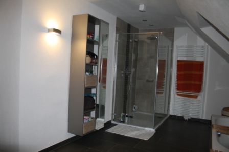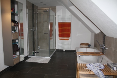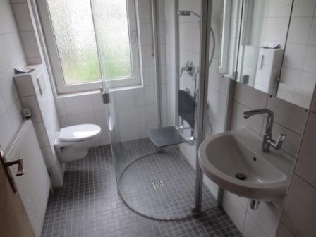 Duschbad und Hauptbadezimmer mit Wash-WC in einheitlichem Design. |