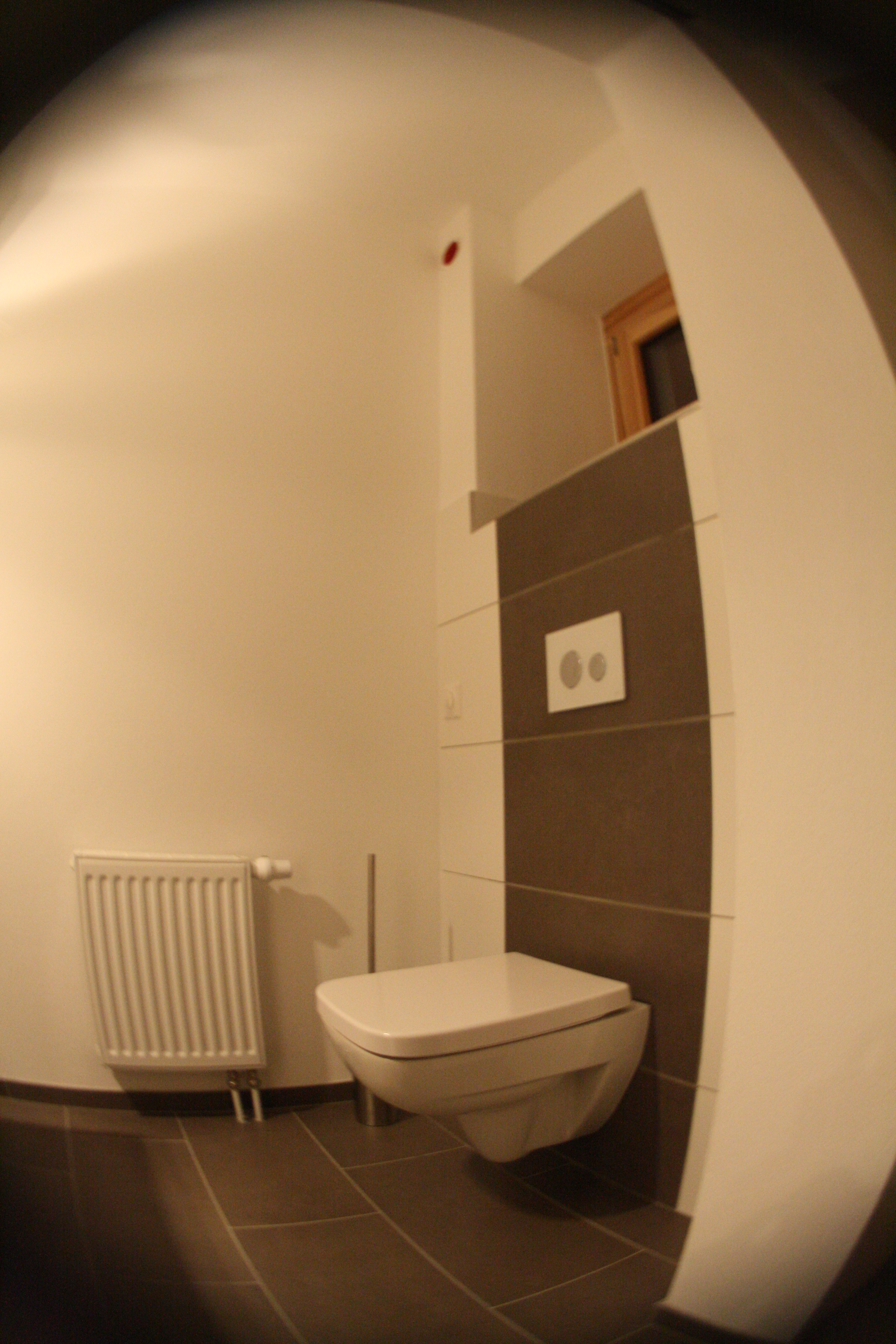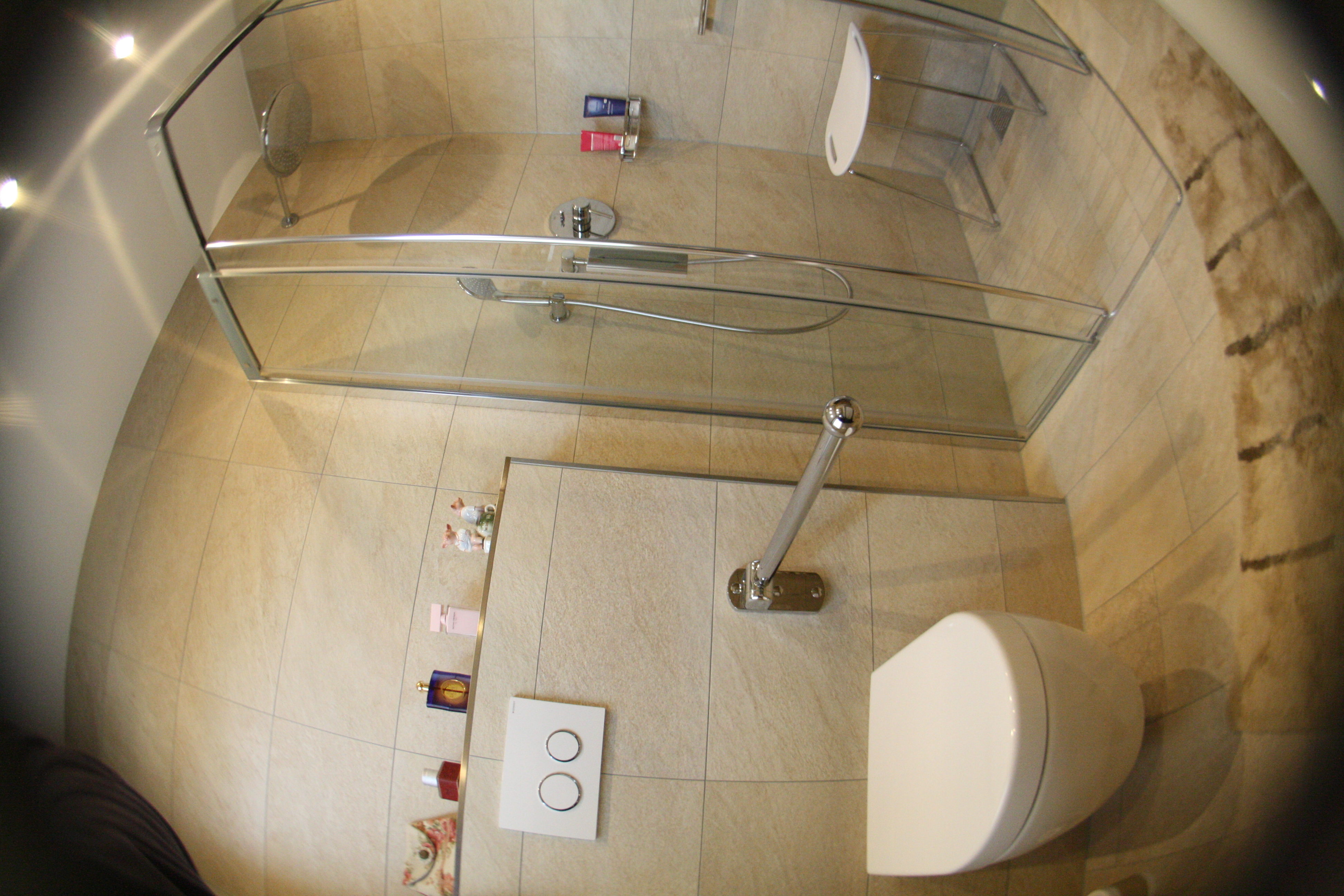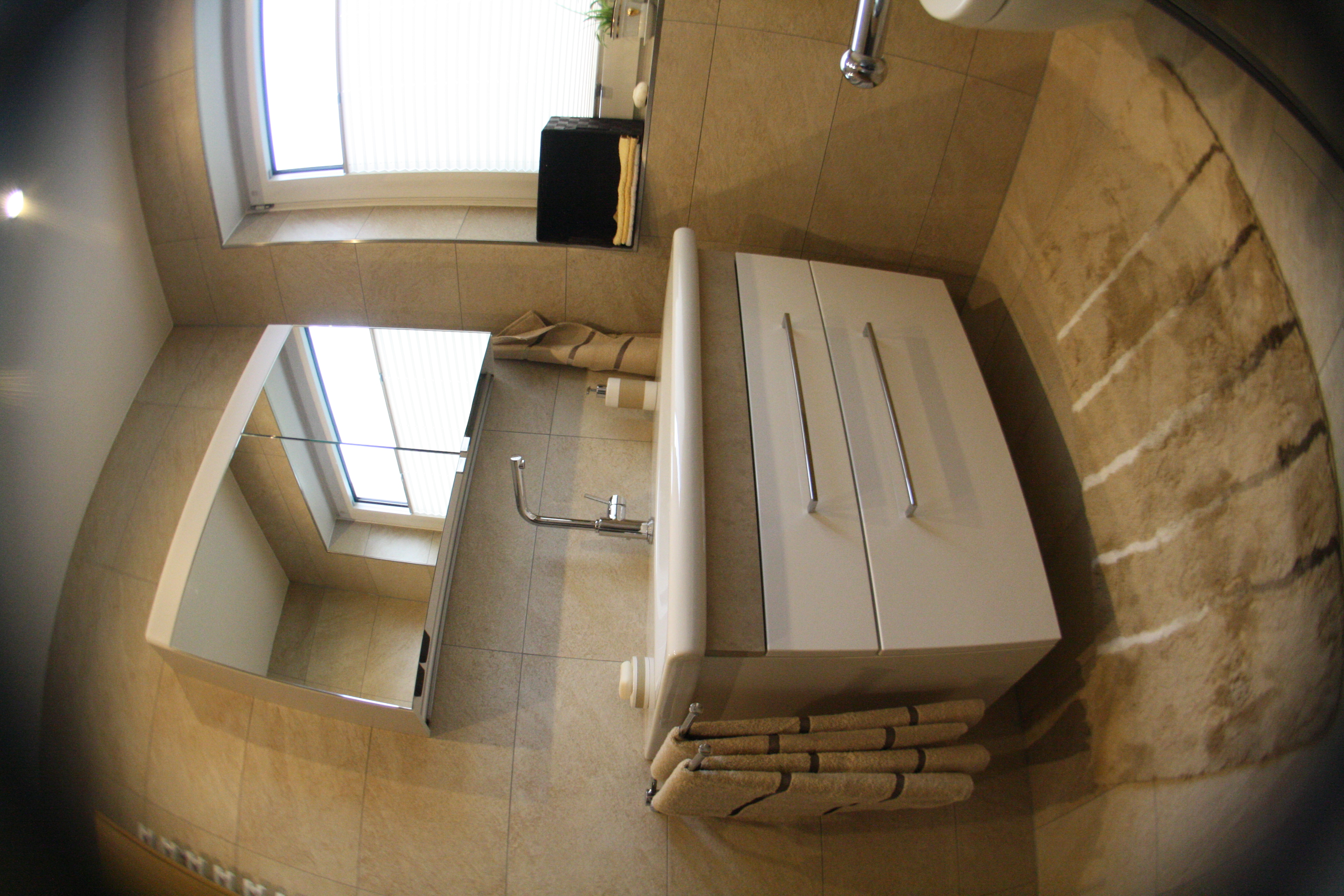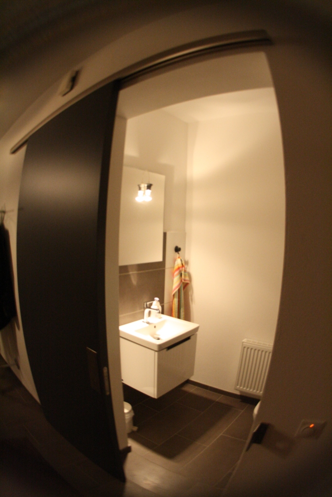 Badezimmer und Gäste-WC mit Schiebetür zur optimalen Nutzung des Raumes. |