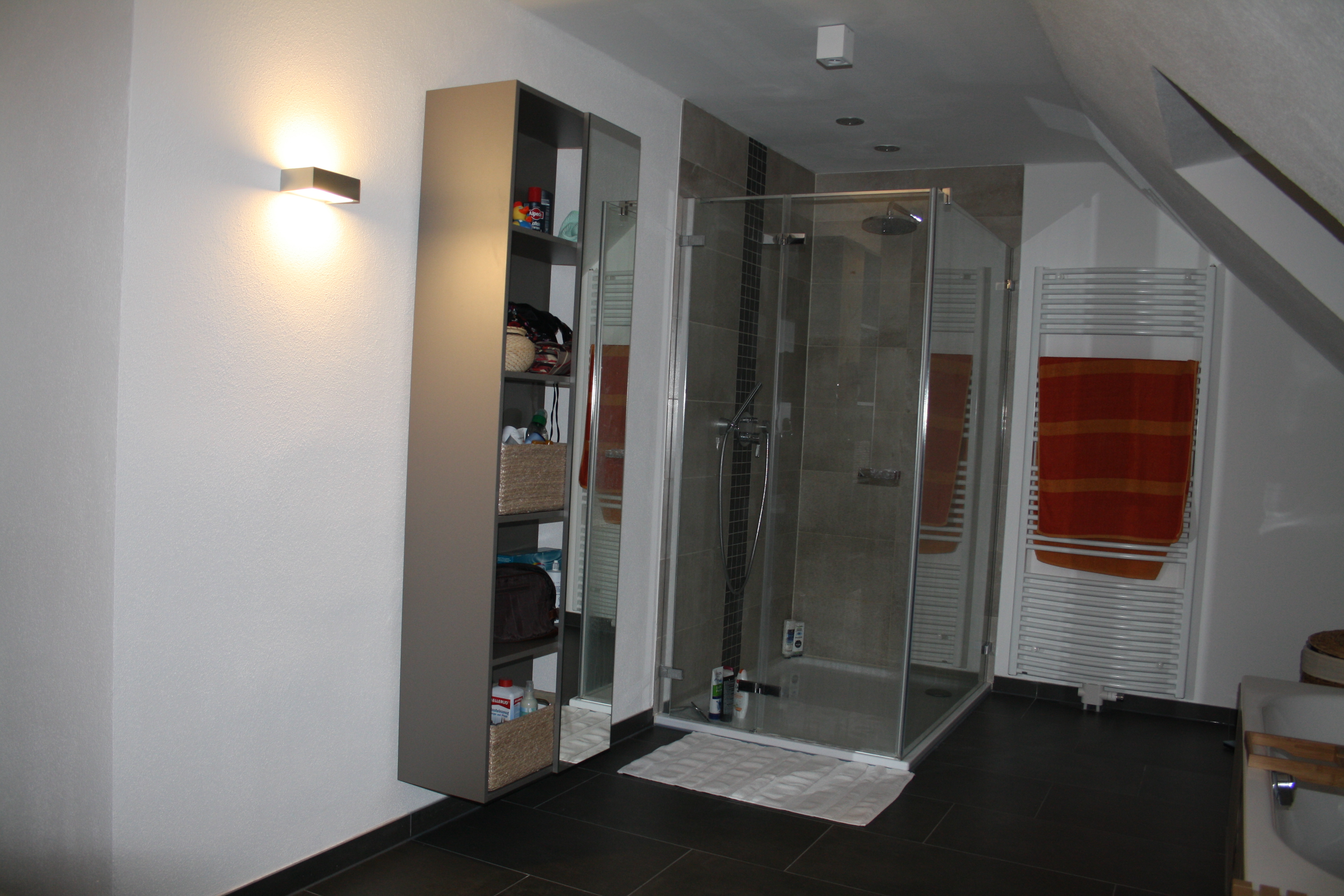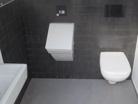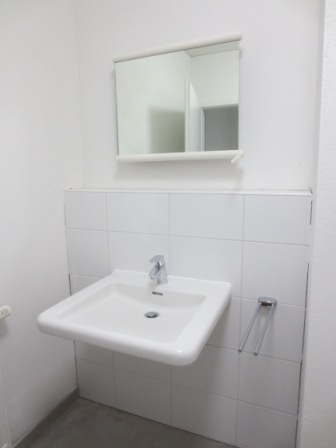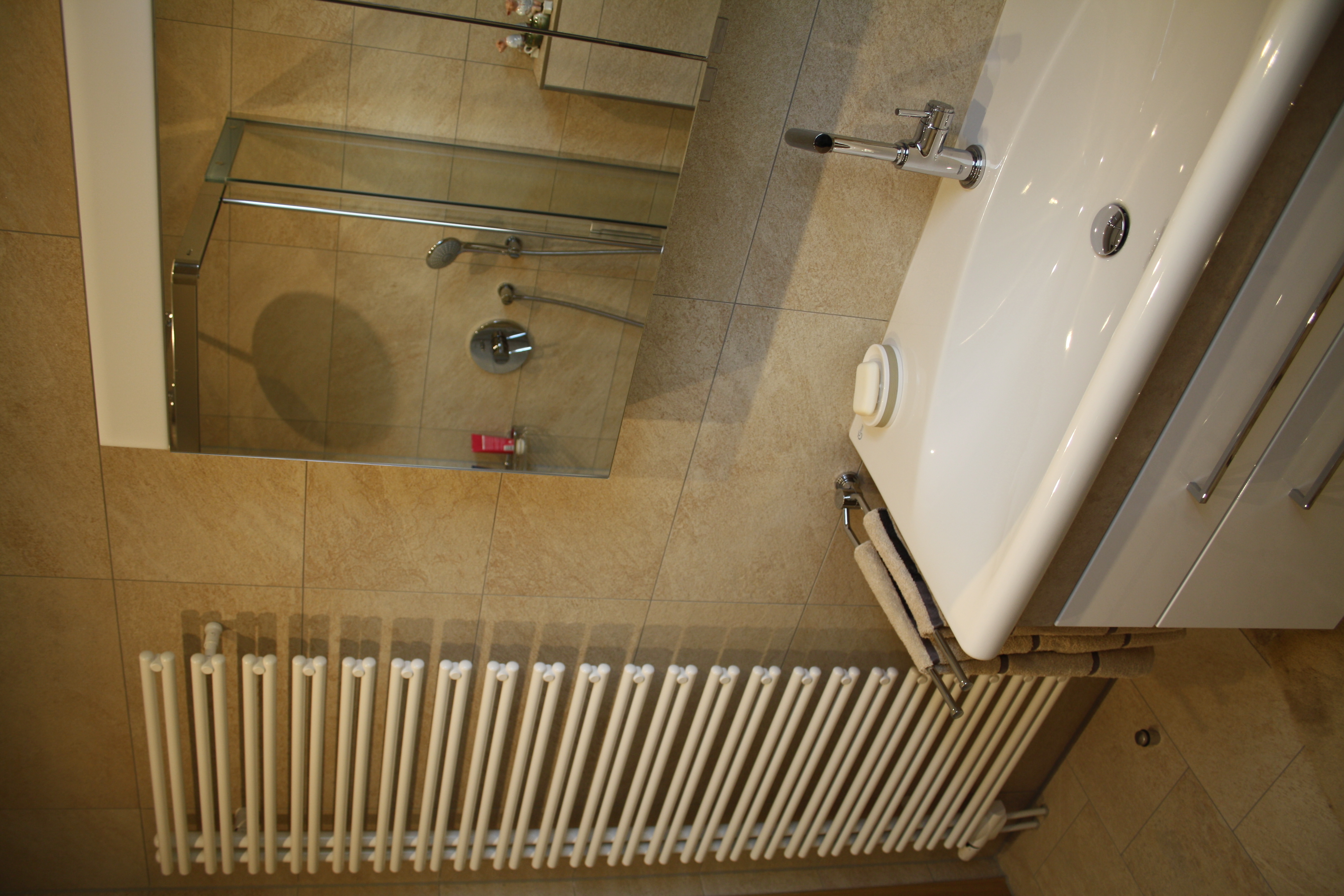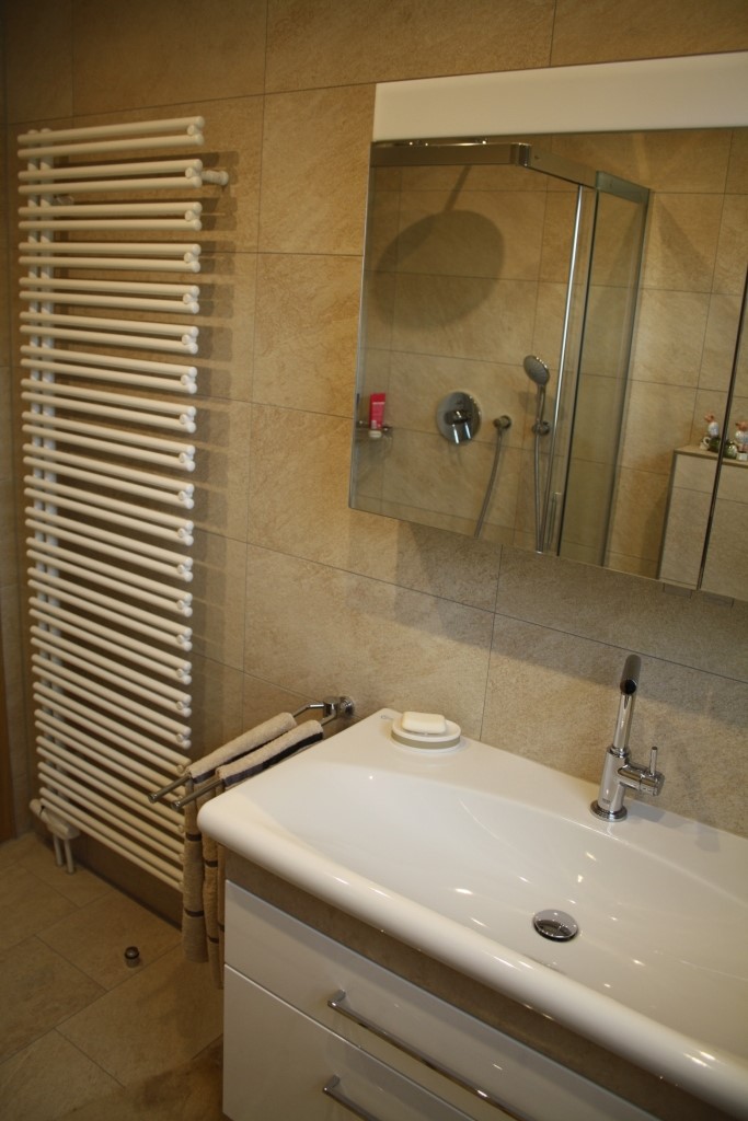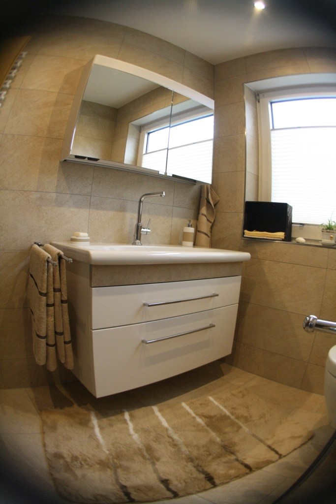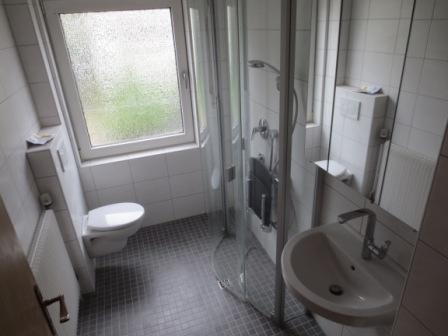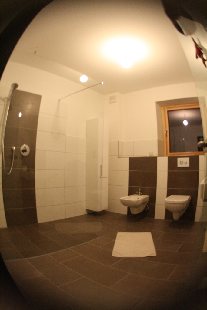 Badezimmer und Gäste-WC mit Schiebetür zur optimalen Nutzung des Raumes. |